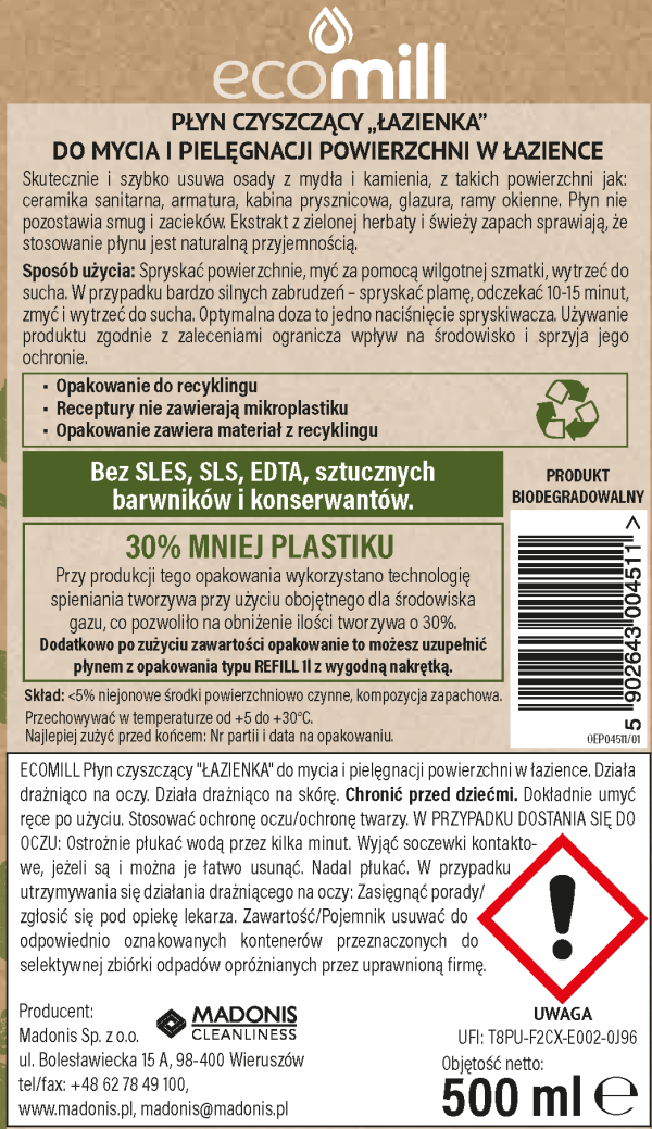 ECOMILL. cleaning liquid BATHROOM – GREEN TEA – 500 ml
