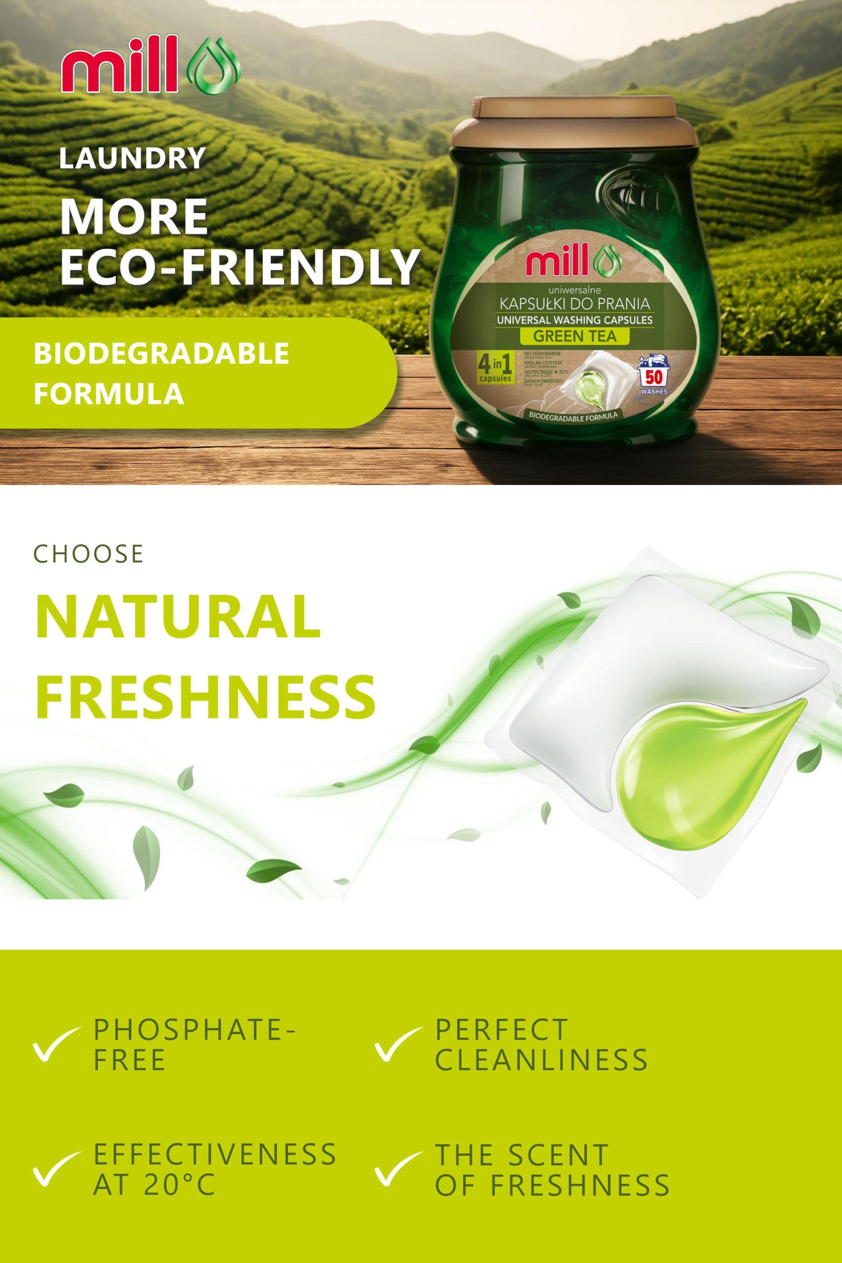 ECOMILL. Universal Laundry Capsules – Green Tea – 50 Capsules