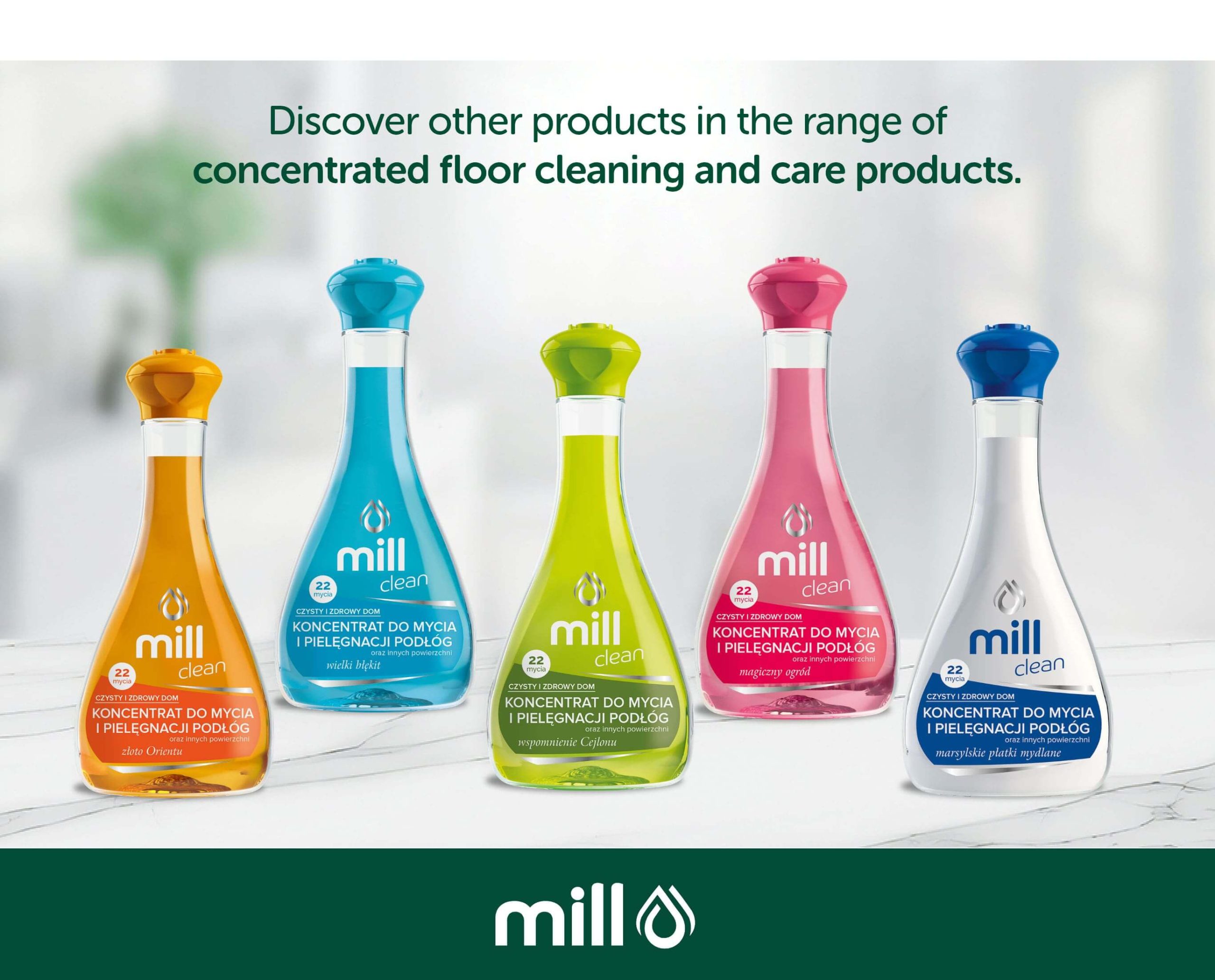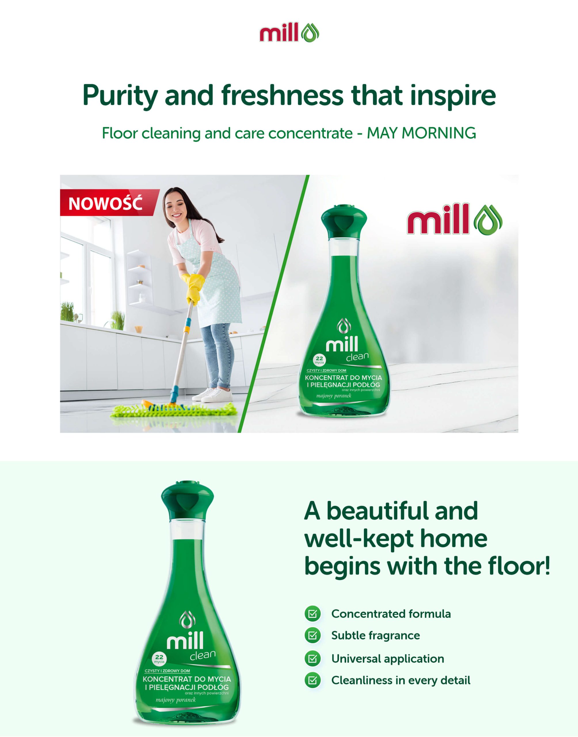 MILL CLEAN home cleaning and care concentrate is a universal cleaning and care agent for cleaning floors and other surfaces – panels, PVC, parquet, porcelain, tiles, MDF, varnished wood.