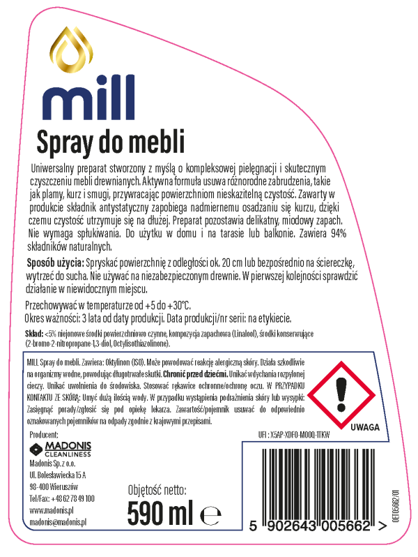 It is a universal preparation for cleaning furniture and caring for wooden furniture. The active formula effectively removes dirt such as stains, dust, streaks. The antistatic component makes it easier to maintain cleanliness and protects against excessive dust build-up. It leaves a fresh, honeyed scent. It contains teak tree extract, which additionally cares for furniture and brings out its natural beauty. No rinsing required.