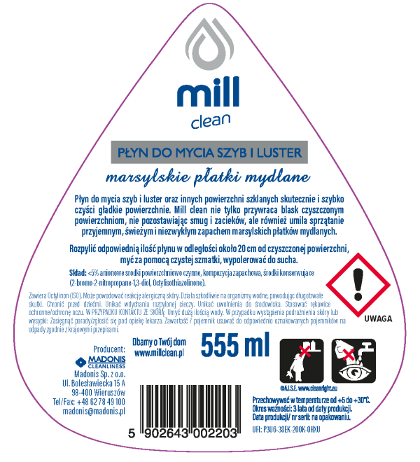 Glass and mirror cleaner and other glass surfaces effectively and quickly cleans smooth surfaces. Mill clean not only restores the shine of the surfaces to be cleaned, leaving no streaks and stains, but also makes cleaning more pleasant with the pleasant, fresh and unusual scent of Marseille soap flakes.
