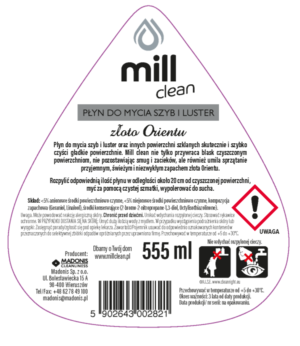 Glass and mirror cleaner and other glass surfaces effectively and quickly cleans smooth surfaces. Mill clean not only restores the shine of the cleaned surfaces, leaving no streaks and stains, but also makes cleaning more pleasant with a pleasant, fresh and unusual scent of Oriental gold.