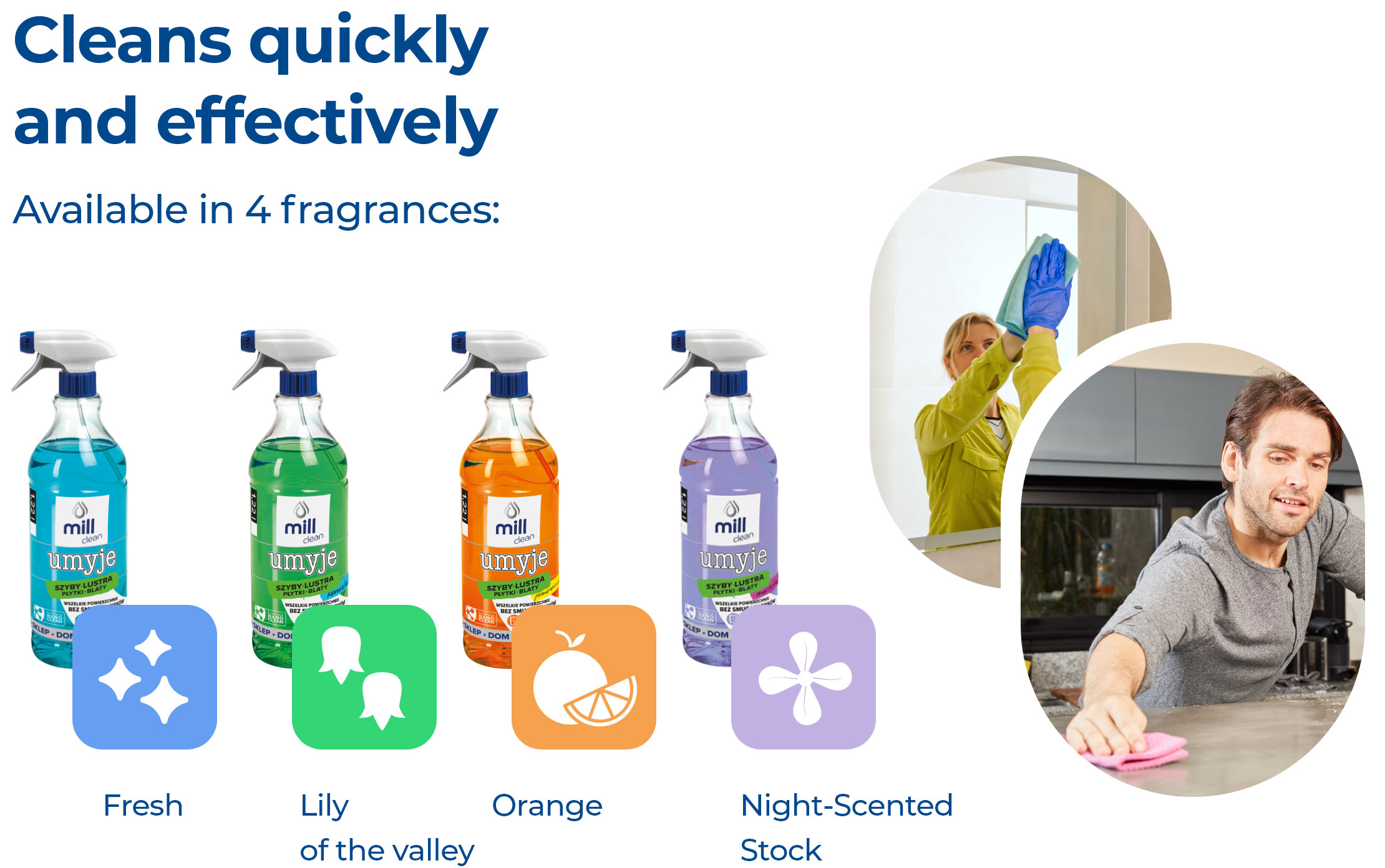Mill clean will not only WASH effectively and efficiently, without streaks and stains, it will clean glass panes, smooth countertops, mirror areas, but above all it will give the cleaned surfaces a crystalline glow.