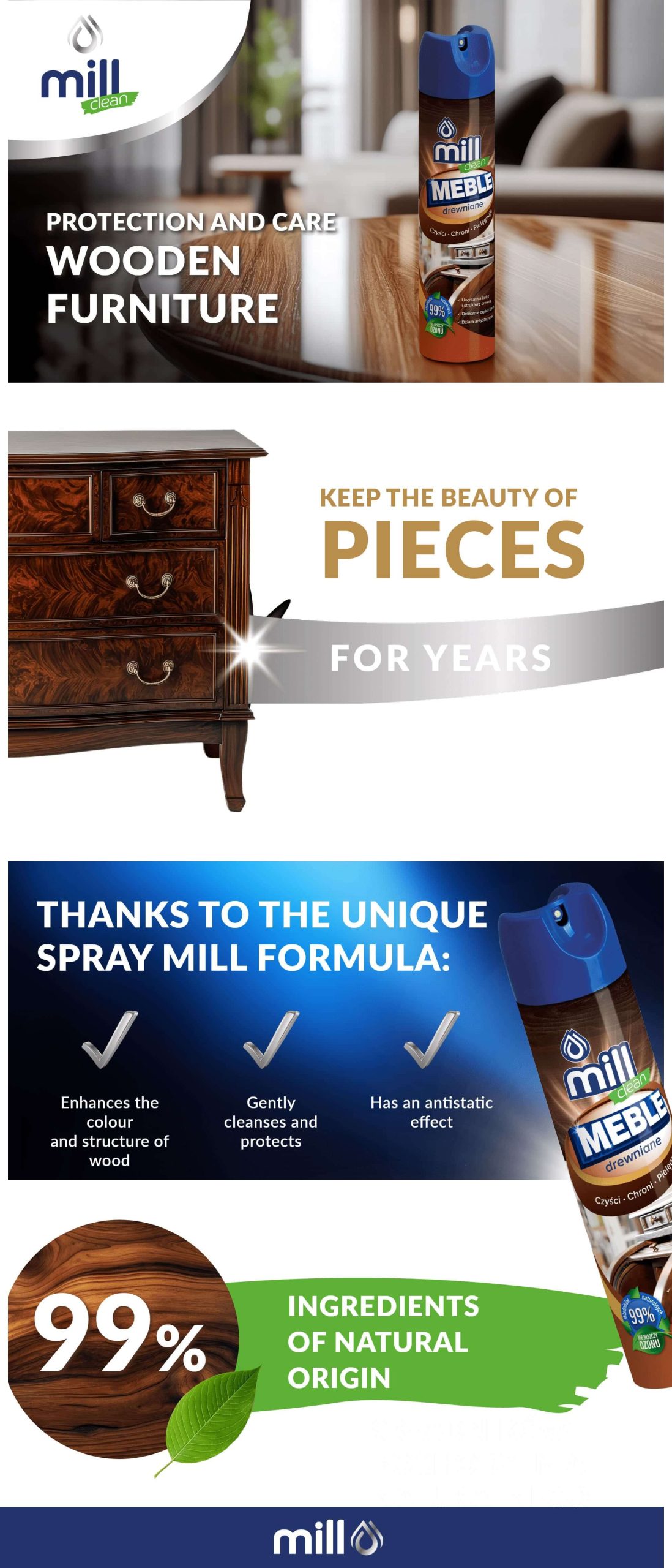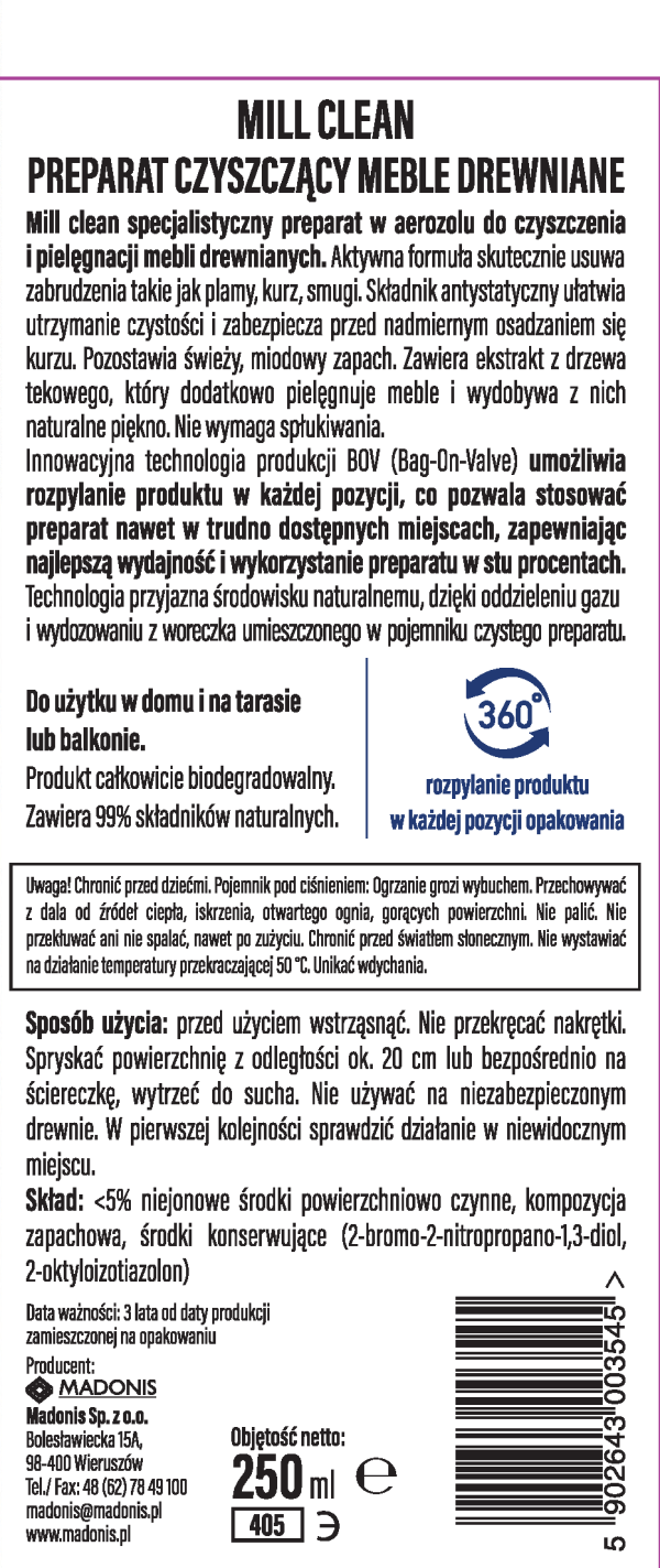 MILL clean is a specialized aerosol preparation for cleaning and caring for wooden furniture.