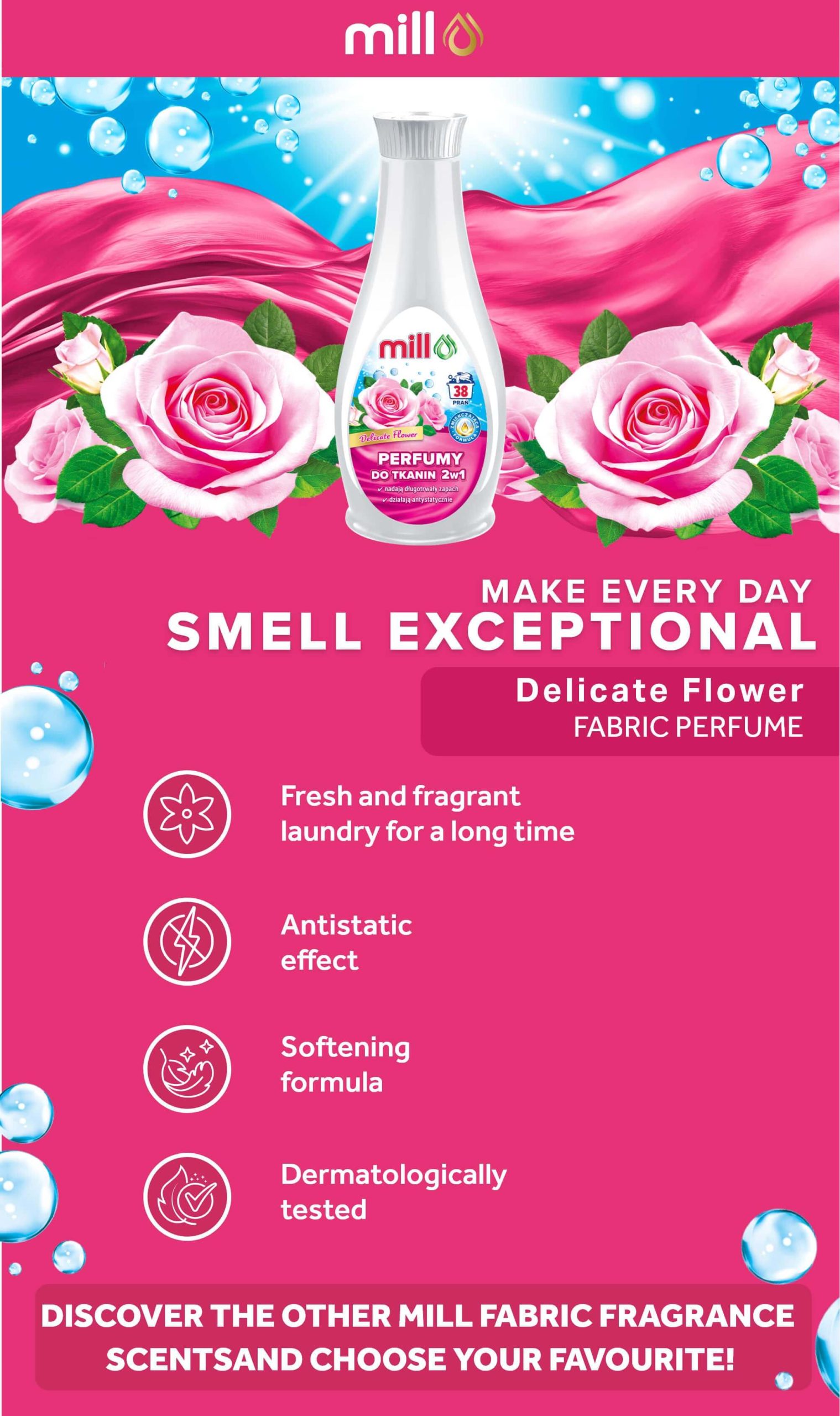 MILL fabric perfumes keep your laundry fresh and fragrant for a long time. The ingredients contained in them prevent the materials from becoming static and give them a pleasant to the touch softness. The MILL DELICATE FLOWER variant is a unique fragrance composition with a distinct sweet and floral note.