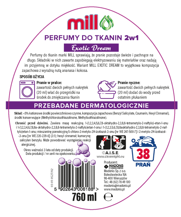 MILL fabric perfumes keep your laundry fresh and fragrant for a long time. The ingredients contained in them prevent the materials from becoming static and give them a pleasant to the touch softness. The MILL EXOTIC DREAM variant is a unique fragrance composition with a distinct hint of pineapple and coconut.