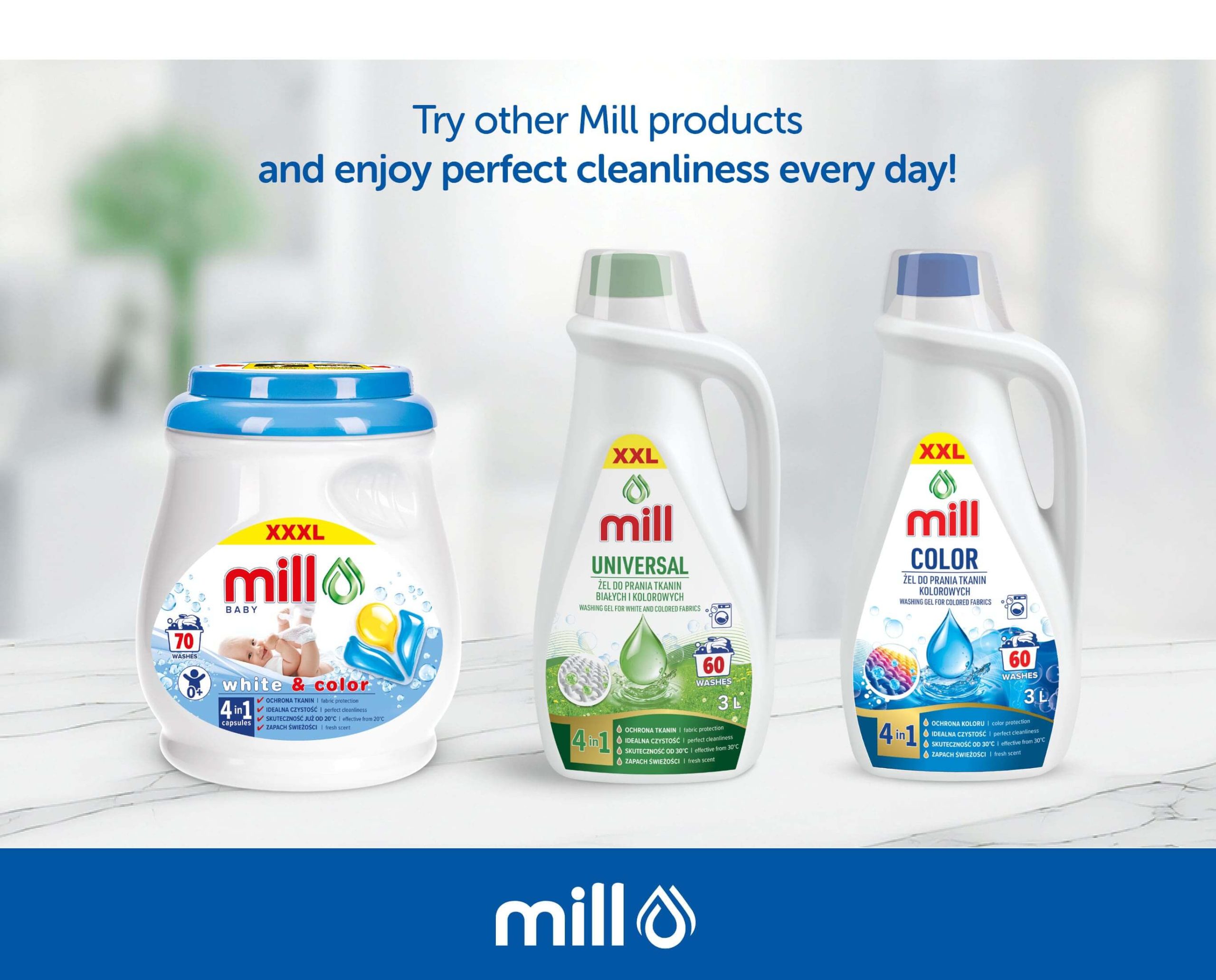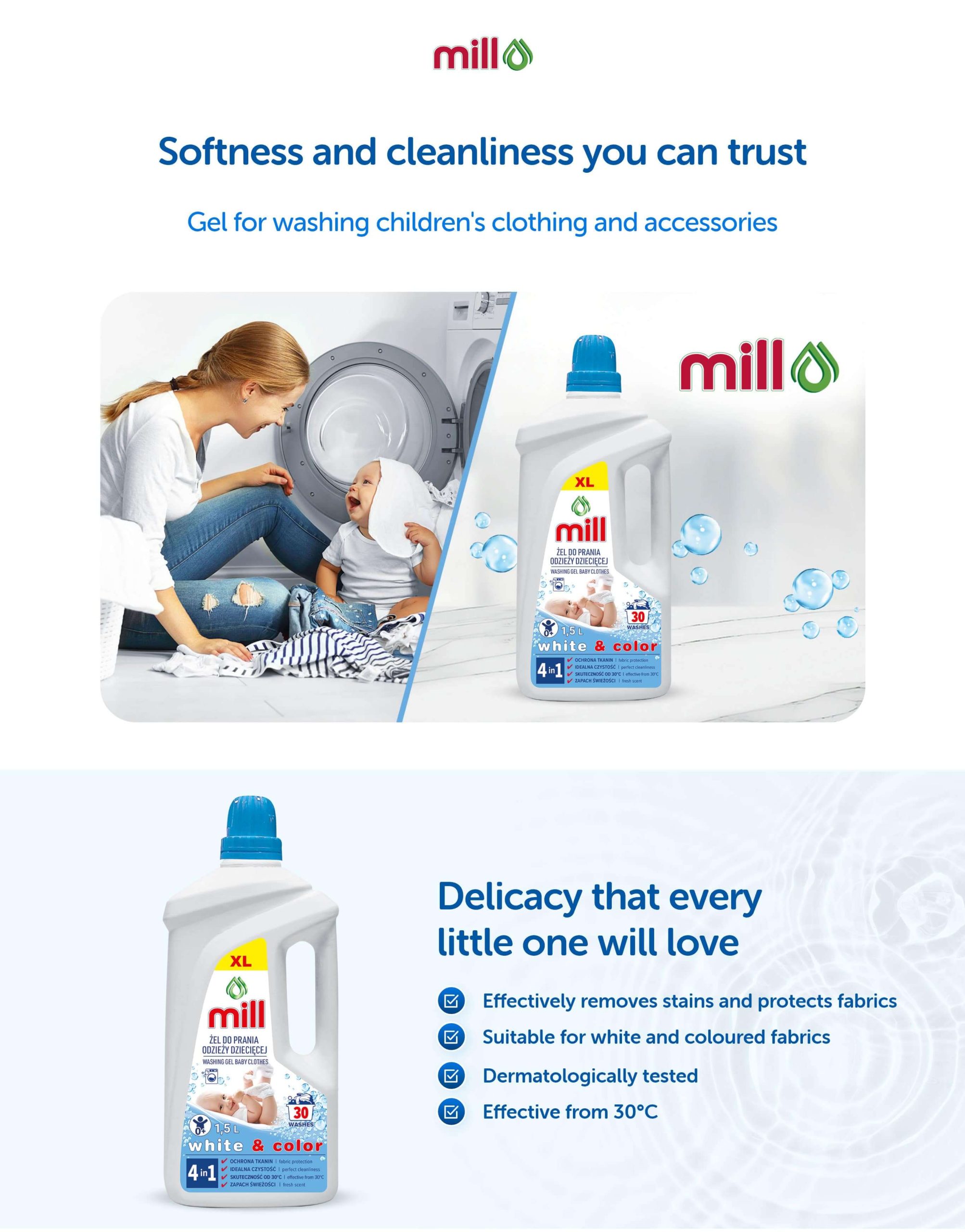 The MILL clean baby concentrated laundry detergent has been developed for the sensitive and delicate skin of the baby. The active substances and water softeners contained in the formula of the liquid will quickly remove stains and dirt. The product does not contain bleaching agents, so it protects the fibers and colors of the washed fabrics. Washing at high temperatures reduces the growth of microorganisms on fabrics.