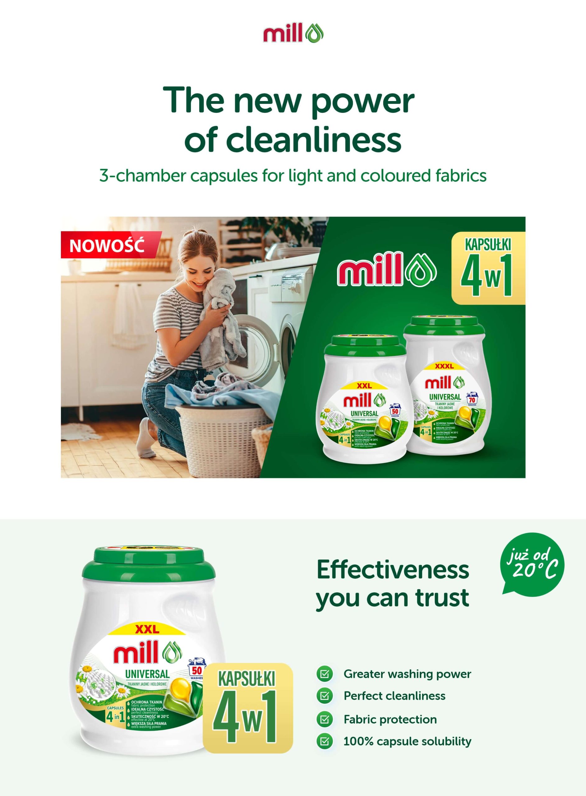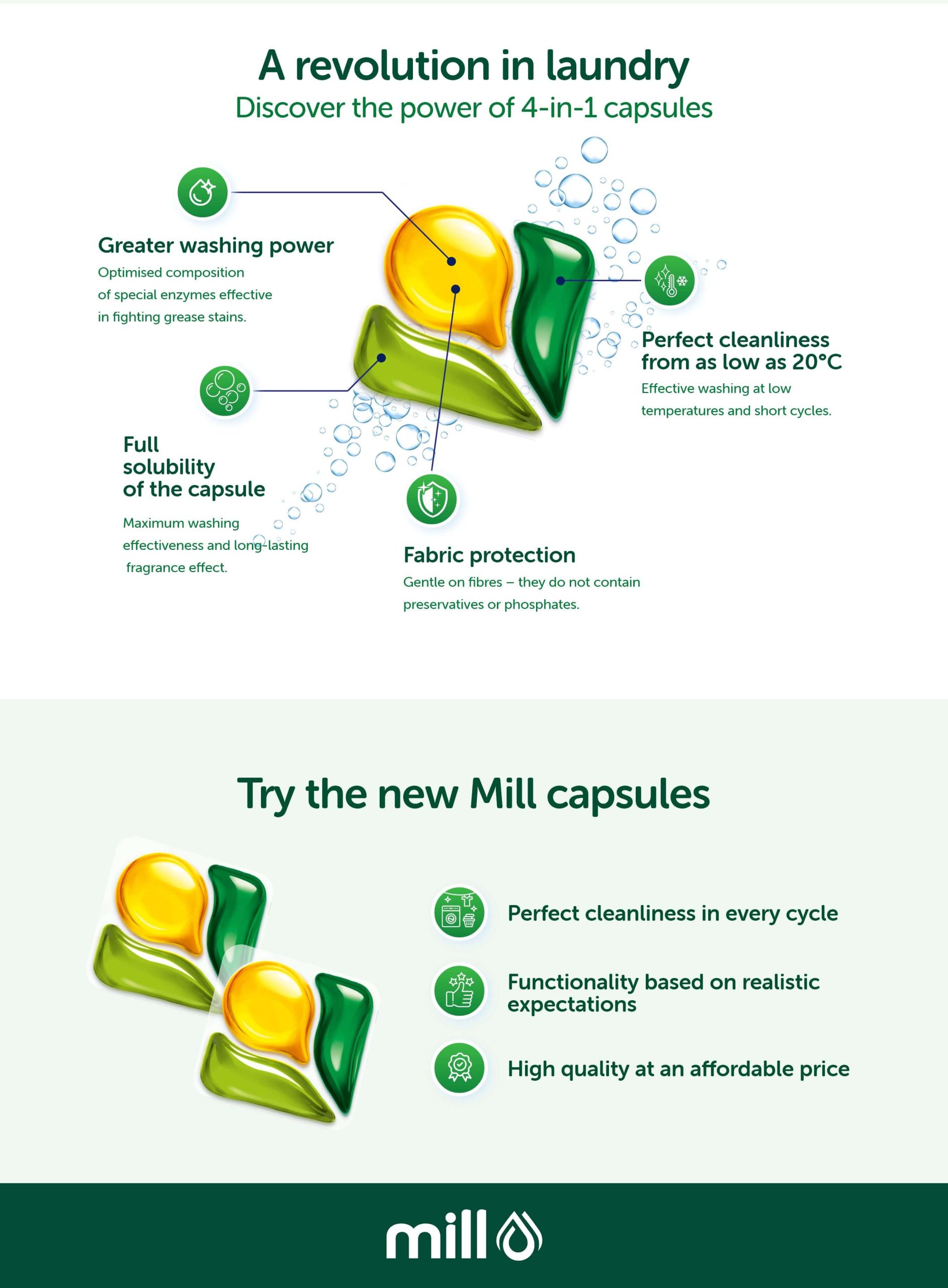 Mill professional capsules will ensure perfect cleanliness and fragrant freshness for your laundry.