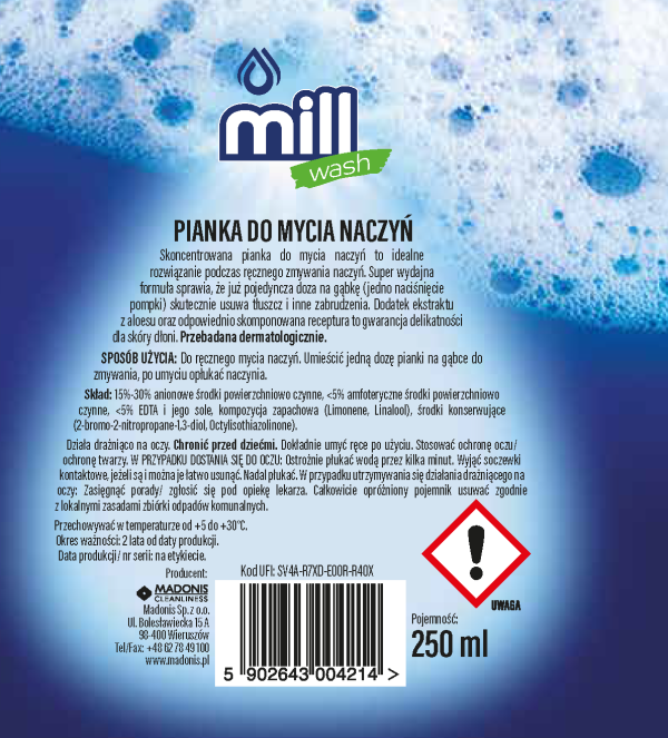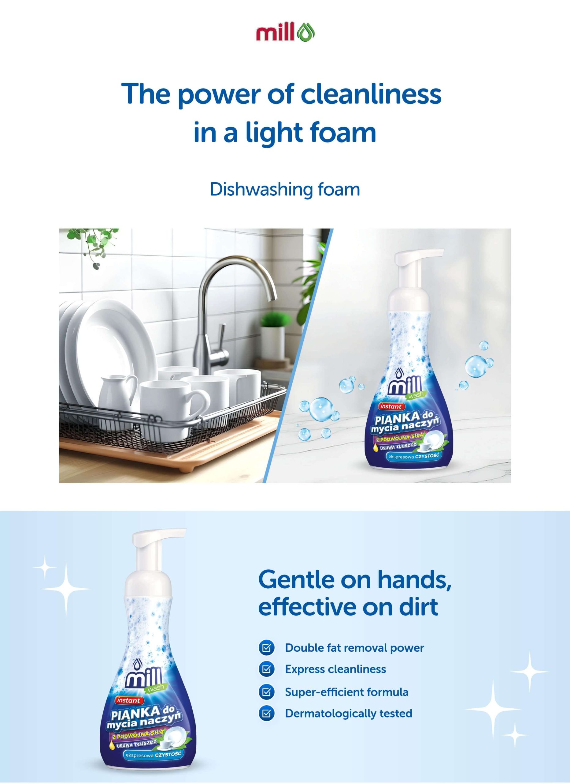 Concentrated dishwashing foam is the perfect solution for hand dishwashing. The super-efficient formula ensures that just a single dose per sponge (one press of the pump) effectively removes grease and other dirt.
