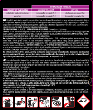 do usunięcia plamy. Kapsułki są bezpieczne dla tkanin, nie zawierają fosforanów. Zawierają substancje zmiękczające wodę oraz kompleks zacho- wujący czarne i ciemne kolory. Wodorozpuszczalna powłoka kapsułki ulega całkowitemu rozpuszczeniu w kontakcie z wodą. Kapsułki nadają tka- ninom świeży, przyjemny zapach. Opakowanie wygodne w przechowywaniu.