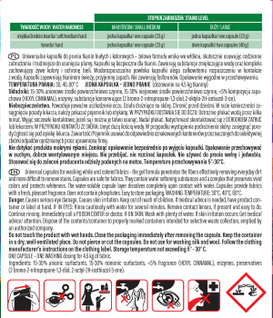 Uniwersalne kapsułki do prania tkanin białych i kolorowych – żelowa formuła wnika we włókna, skutecznie usuwając codzienne zabrudzenia i trudniejsze do usunięcia plamy. Kapsułki są bezpieczne dla tkanin. Zawierają substancje zmiękczające wodę oraz kompleks zachowujący żywe kolory i ochronę bieli. Wodorozpuszczalna powłoka kapsułki ulega całkowitemu rozpuszczeniu w kontakcie z wodą. Kapsułki zapewniają tkaninom świeży, przyjemny zapach. Nie zawierają fosforanów. Opakowanie wygodne w przechowywaniu.