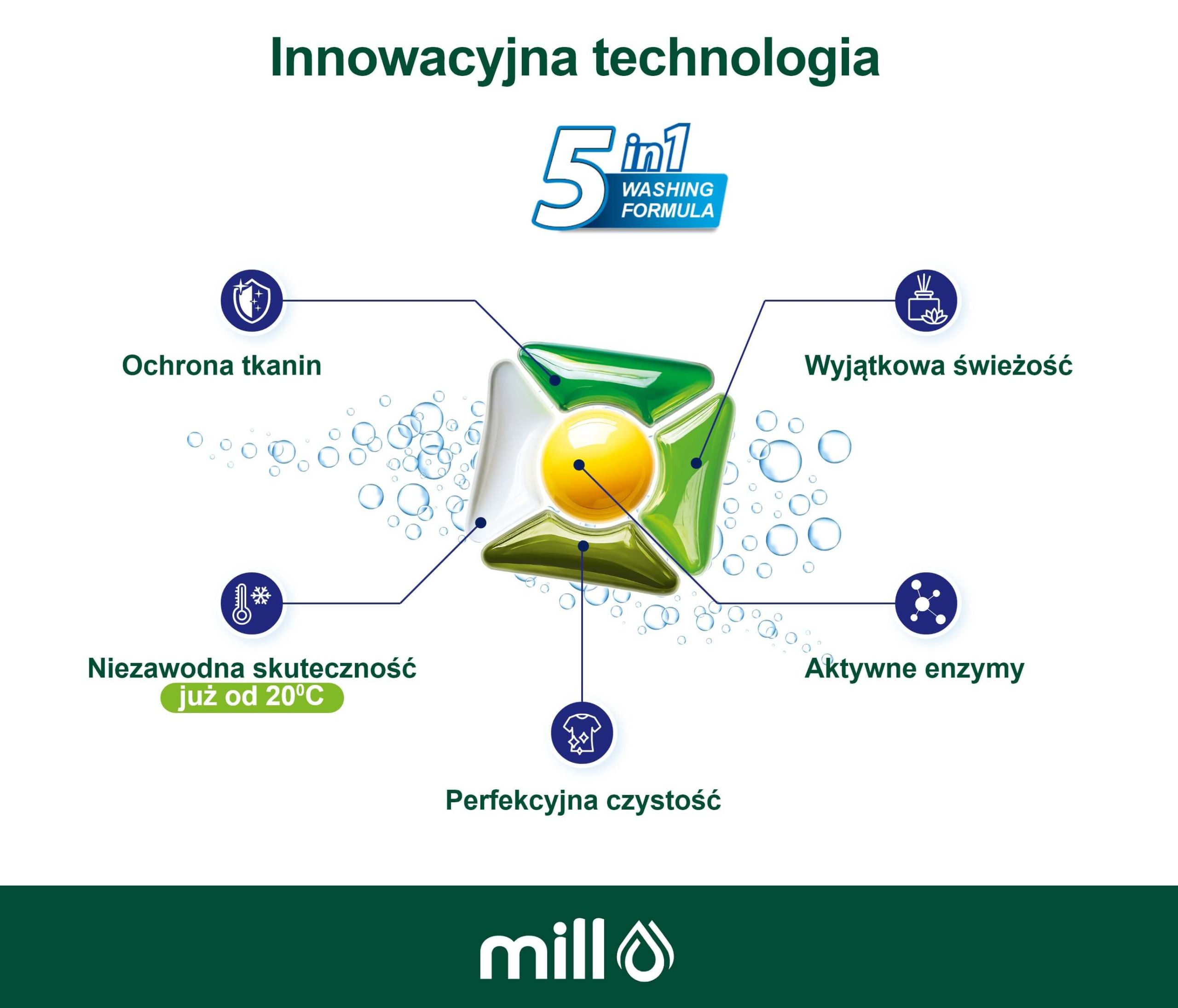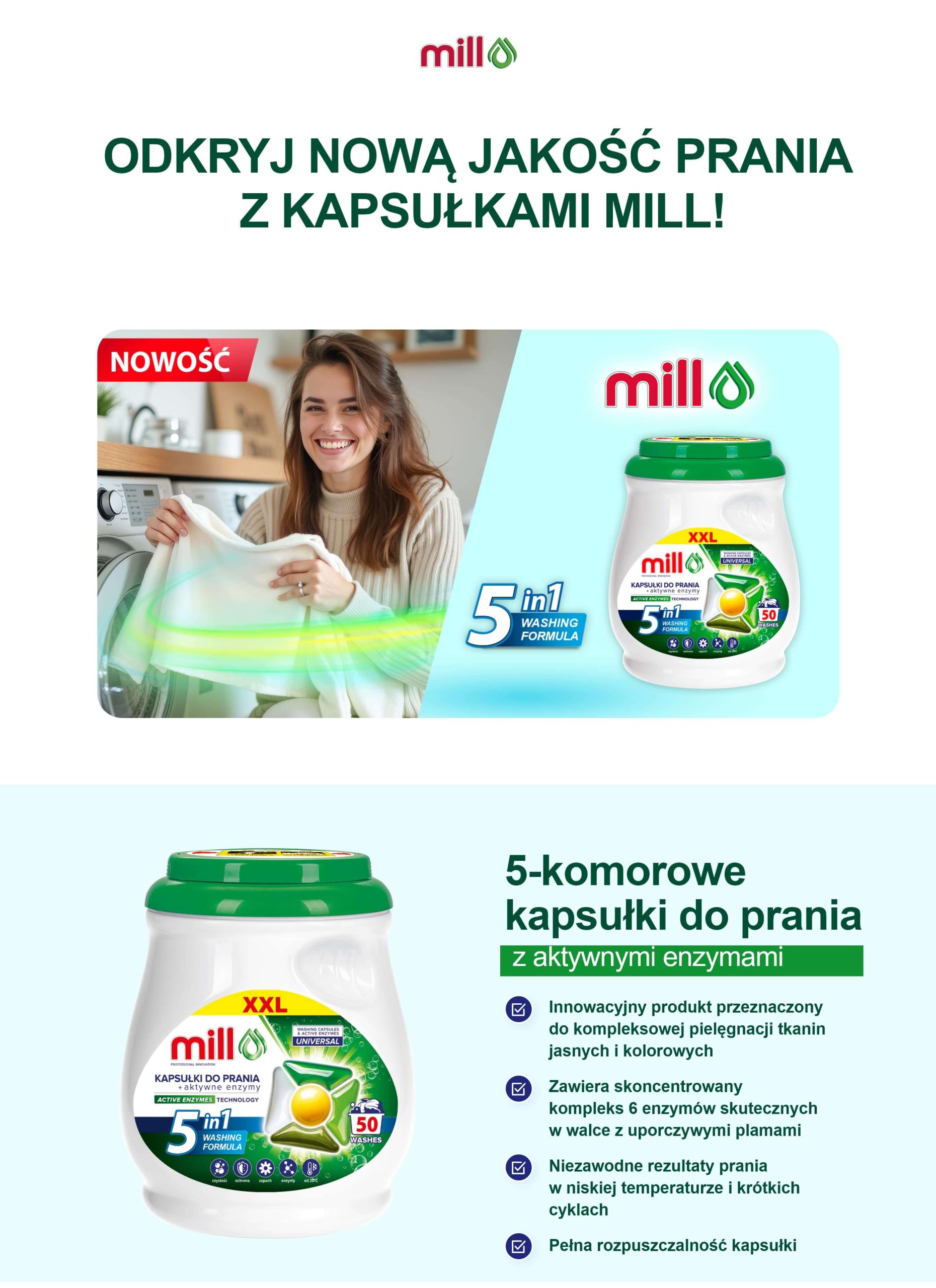 Mill Produkty PRANIE KAPSUŁKI DO PRANIA MILL Kapsułki do prania UNIWERSALNE + aktywne enzymy 50 szt. 5KKP.S