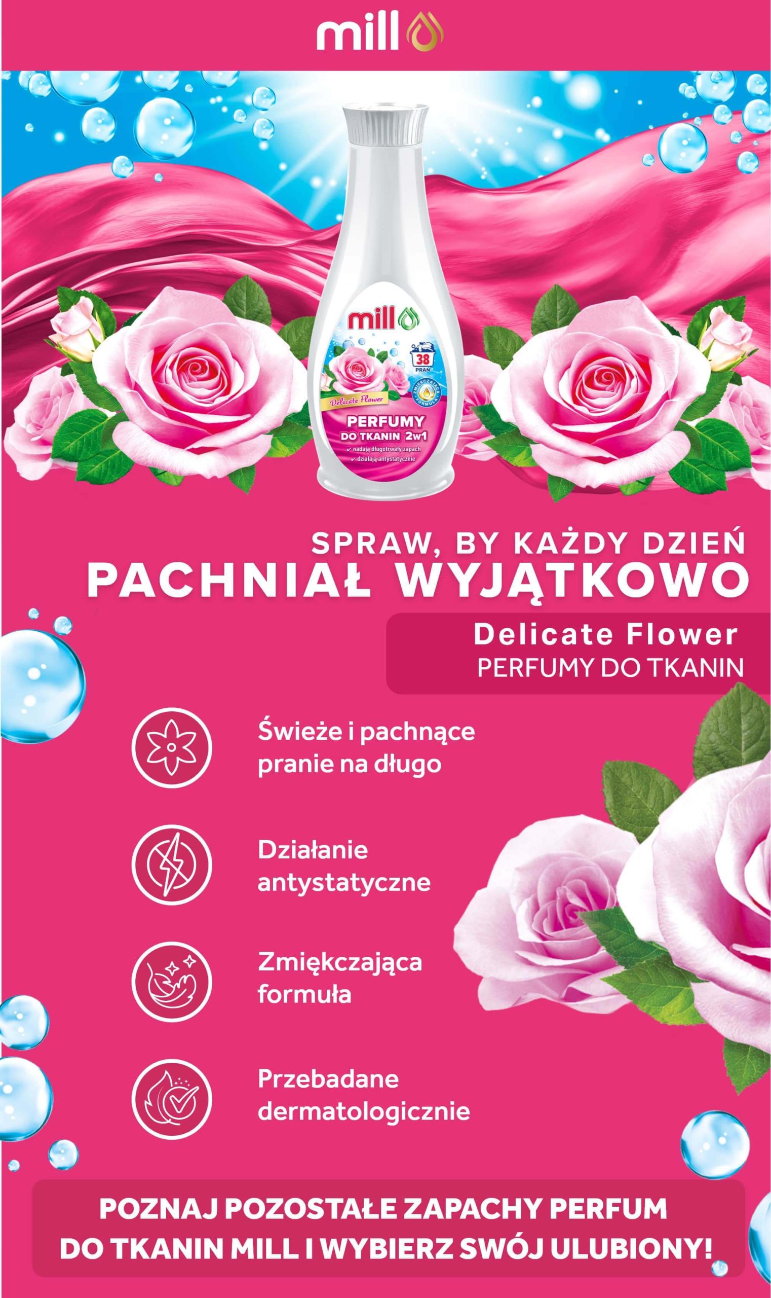 Perfumy do tkanin marki MILL sprawiają, że pranie pozostaje świeże i pachnące na długo. Składniki w nich zawarte zapobiegają elektryzowaniu się materiałów oraz nadają im przyjemną w dotyku miękkość. Wariant MILL DELICATE FLOWER to wyjątkowa kompozycja zapachowa z wyraźną nutą słodko-kwiatową.