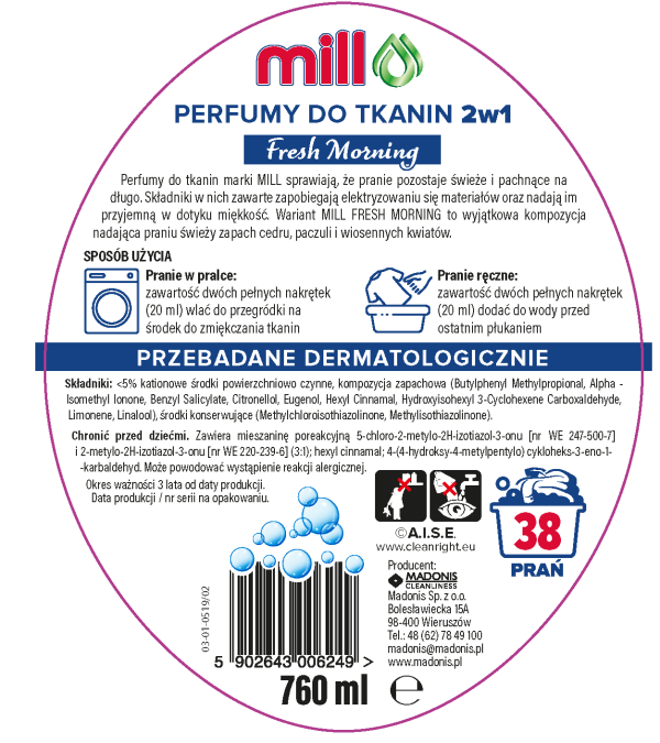 Perfumy do tkanin marki MILL sprawiają, że pranie pozostaje świeże i pachnące na długo. Składniki w nich zawarte zapobiegają elektryzowaniu się materiałów oraz nadają im przyjemną w dotyku miękkość. Wariant MILL FRESH MORNING to wyjątkowa kompozycja nadająca praniu świeży zapach cedru, paczuli i wiosennych kwiatów.