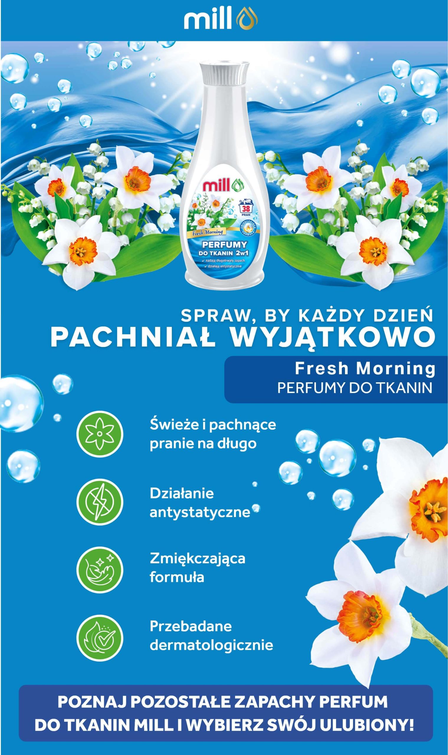 Perfumy do tkanin marki MILL sprawiają, że pranie pozostaje świeże i pachnące na długo. Składniki w nich zawarte zapobiegają elektryzowaniu się materiałów oraz nadają im przyjemną w dotyku miękkość. Wariant MILL FRESH MORNING to wyjątkowa kompozycja nadająca praniu świeży zapach cedru, paczuli i wiosennych kwiatów.